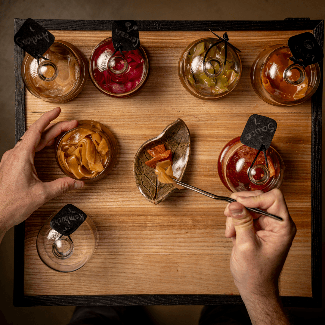 Un canto al buen vivir, la lentitud y la tranquilidad que ha inspirado unos aperitivos que degustan los asistentes al finalizar la visita, creados exprofeso por Carito Lourenço como una prolongación sensorial de la exposición. “La gastronomía también es artesanía. Trabajamos con materia, con tiempo y con procesos lentos, igual que ocurre en los oficios que aparecen en la exposición. Todo parte de una misma idea: el respeto por los saberes que se transmiten con las manos y con la experiencia”, explica Carito Lourenço.