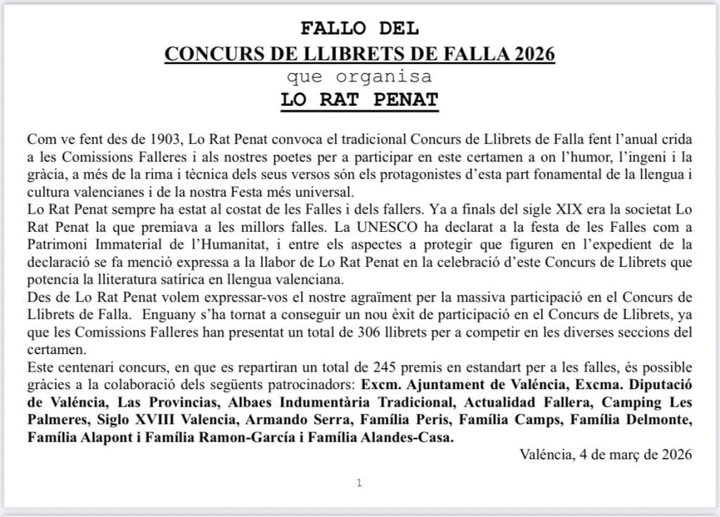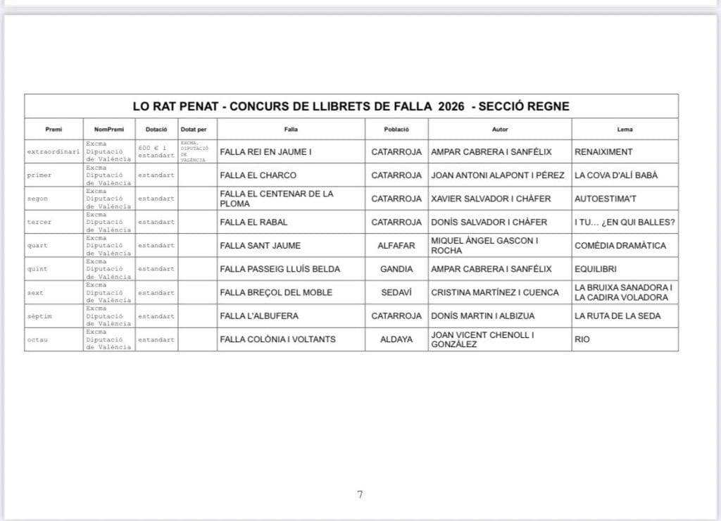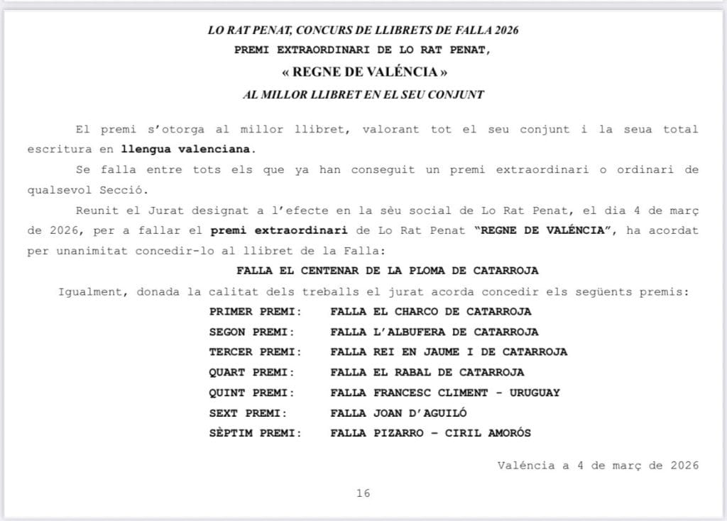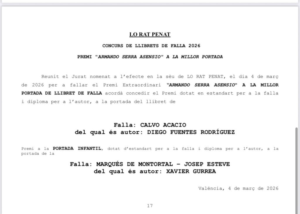 Además, Lo Rat Penat ha otorgado otros premios extraordinarios. El Regne de Valencia ha sido para la falla el Centenar de la Ploma de Catarroja. El Armando Serra de mejor portada, para Diego Fuentes, de la falla Calvo Acacio, y la portada infantil para Xavier Gurrea con la falla Marqués de Montortal-Josep Esteve.