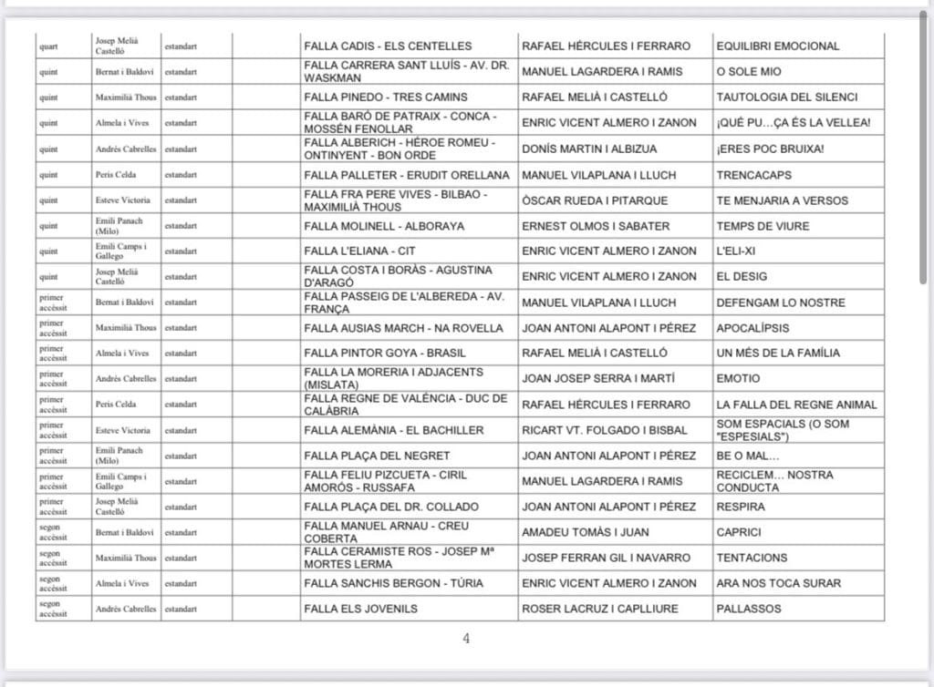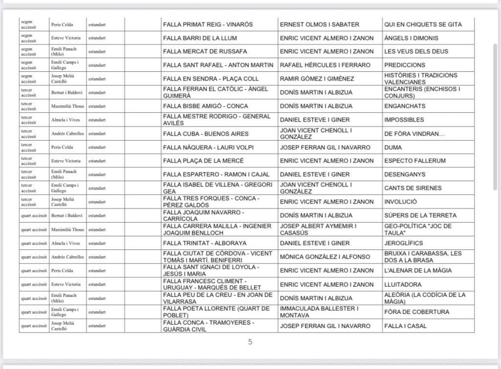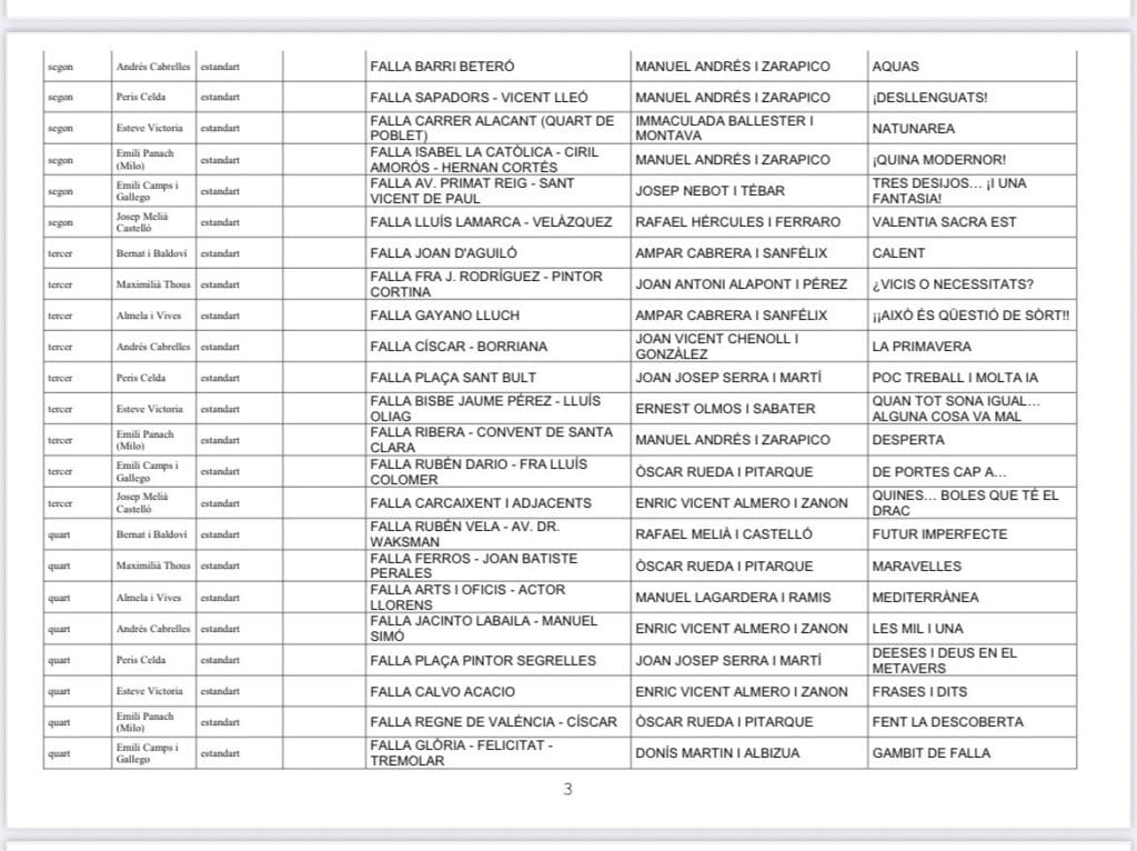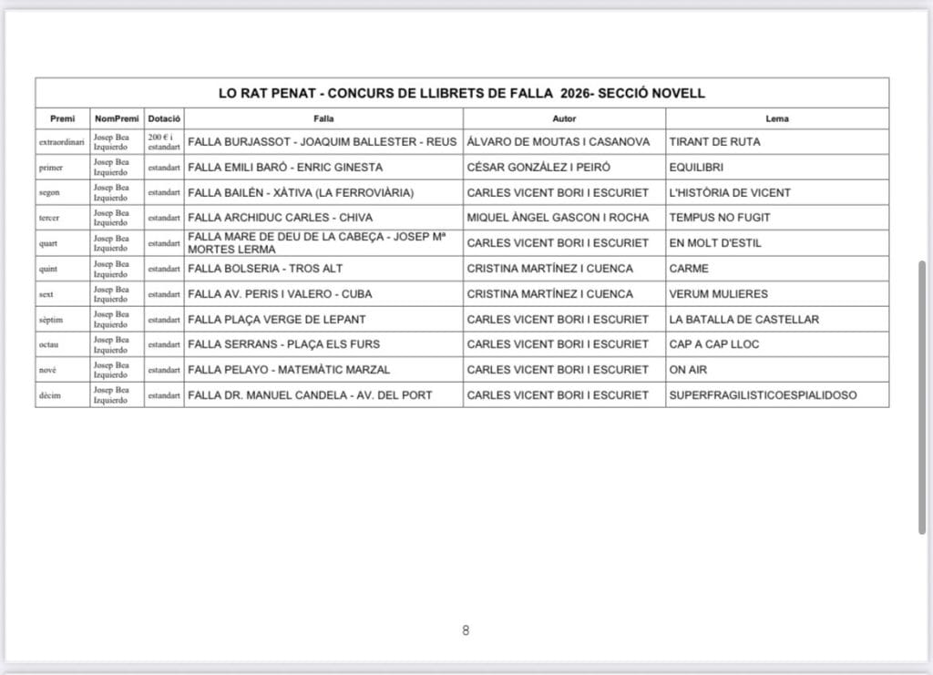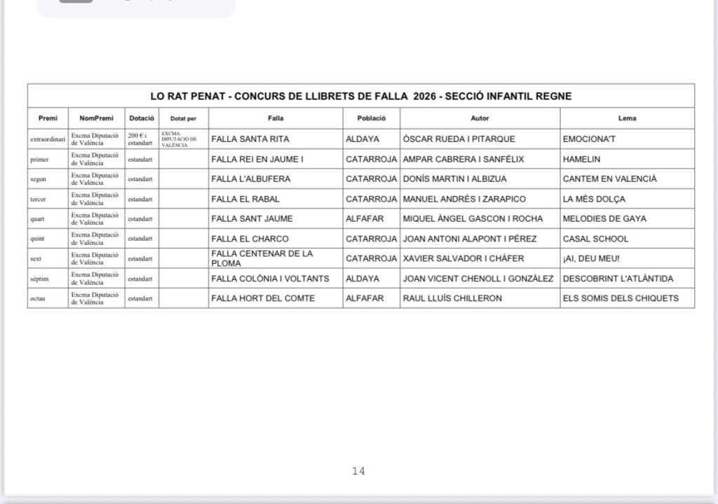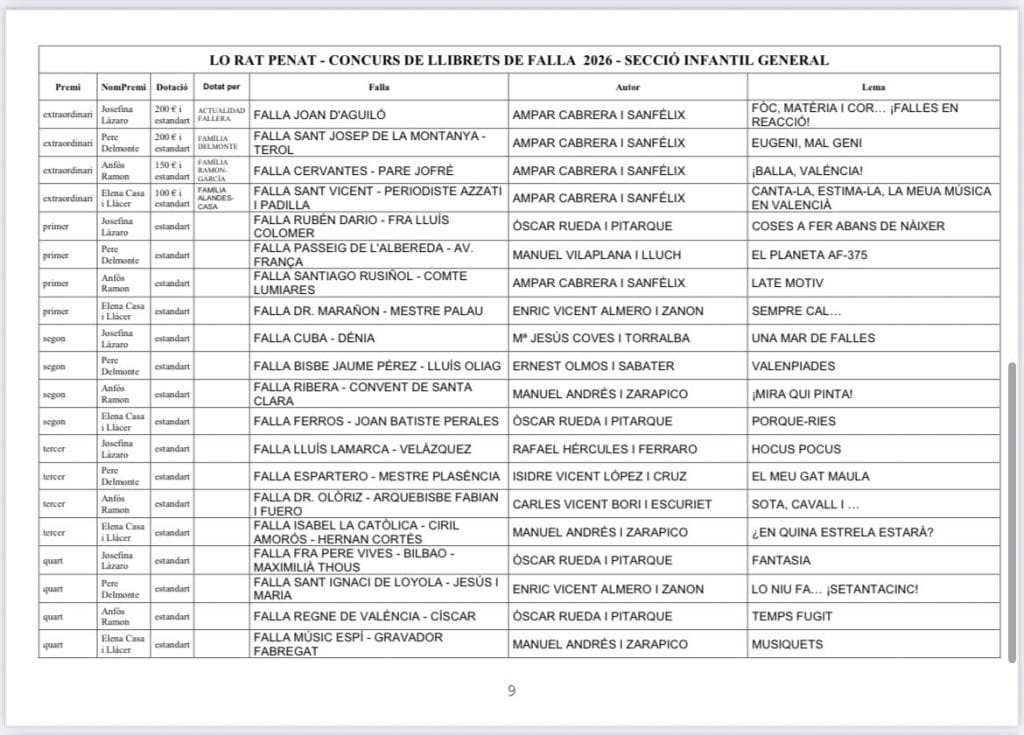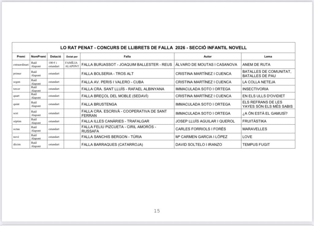 En sección Regne infantil, el triunfador ha sido Òscar Rueda con el premio Diputación para la falla Santa Rita de Aldaya, con el lema ‘Emociona’t’. Y en infantil Novell, de nuevo Álvaro de Moutas ha ganado con la falla Avda. Burjassot-Joaquim Ballester-Reus, con el lema ‘Anem de ruta’, premiado con 100 euros.